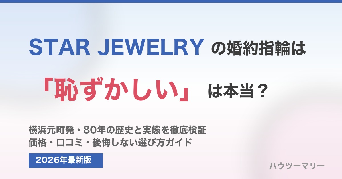 「スタージュエリーの婚約指輪は恥ずかしい」は一部のSNS上に存在する意見ですが、実態は「ファッションジュエリーのイメージが強い」「若い世代向け」という先入観に基づく印象論です。スタージュエリーは1946年創業・横浜元町発祥の80年の歴史を持つ国内ブランドで、婚約指輪は約15万円台〜の本格仕様。デザイン・品質・アフターサービスいずれも国内ブライダルブランドとして高水準です。「恥ずかしい」と感じるかどうかは受け取る相手の価値観によりますが、ブランド自体の品質に問題はありません。